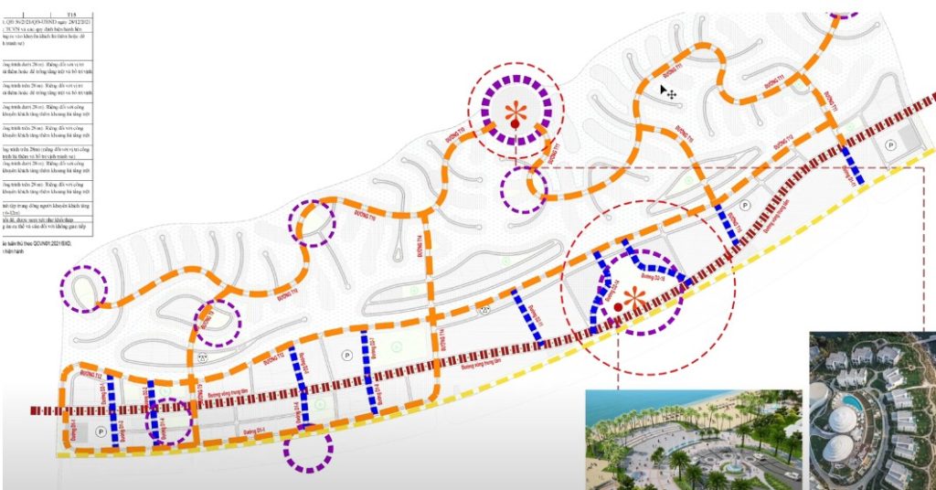 • Đường nội bộ cấp 1 (21–26m): kết nối các tiểu khu biệt thự ven sông, khu quảng trường biển và các cụm khách sạn 5 sao.
